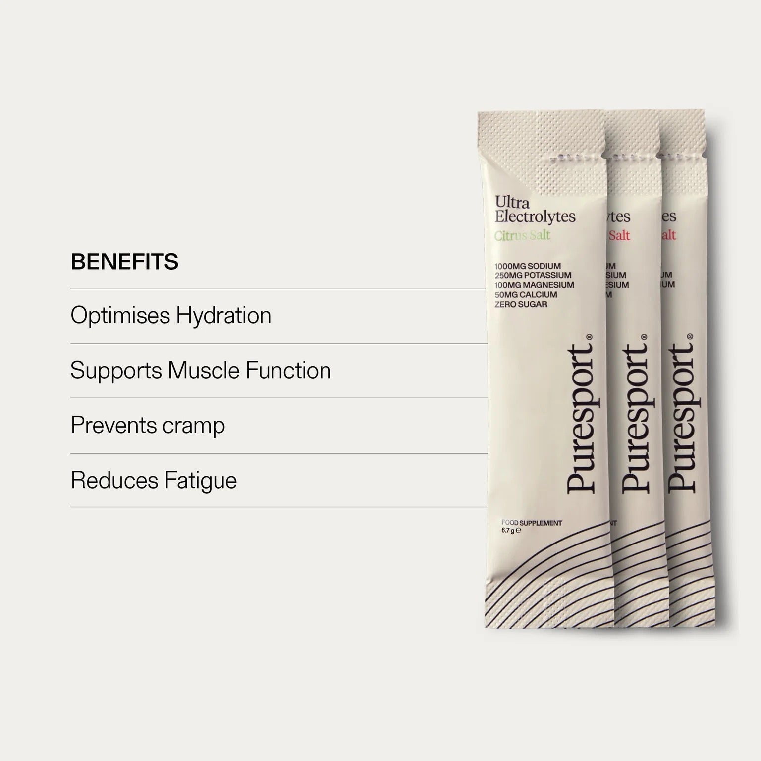 Puresport's Ultra Electrolytes is a scientifically formulated electrolyte solution designed for athletes and active individuals who require optimal hydration during exercise. With a balanced combination of 1000mg sodium, 250mg potassium, 100mg magnesium, and 50mg calcium, this electrolyte drink replenishes essential minerals lost during sweat, helping to maintain hydration, muscle function, and endurance. The Discovery pack contains 10 sachets of each of Citrus, Raspberry and Watermelon flavours.